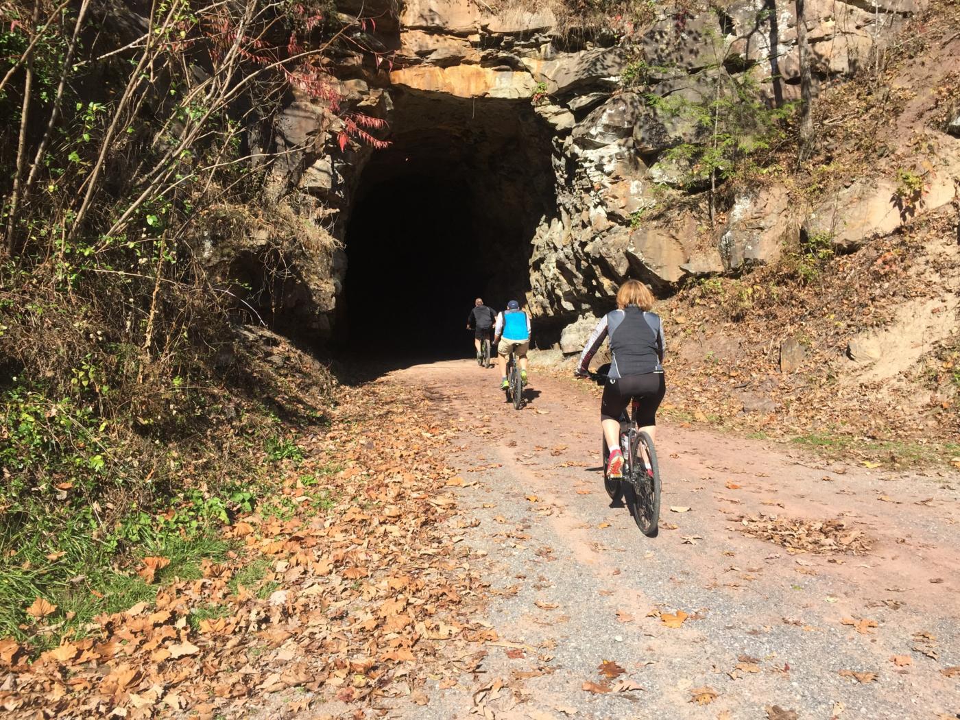 Our plan was to ride to and through the tunnel, have lunch and return. At about 15 miles the tunnel came into view. We could not see through to the other side and it seemed a bit daunting. In fact I found a story in the Washington Post from the late 90’s where the writer/photographer walked all the way to the spot but couldn’t conjure the nerve required to walk through the 500 foot passage — leaving without the photo she went there to take.