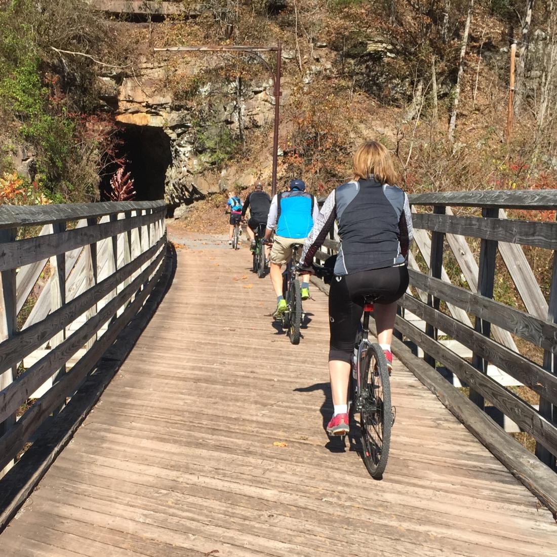 Though it was dark and a bit scary — we had safety in numbers and rolled through without any problems. The tunnel curves a bit and once around the bend we could see the proverbial light at the end of the well, tunnel. We were surprised once on the other side by a long trestle over the river.