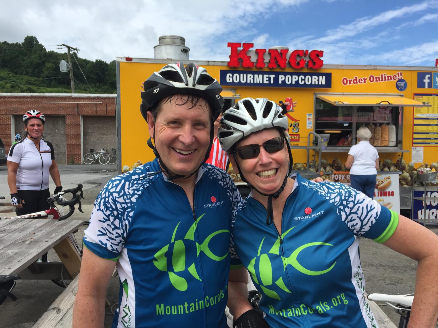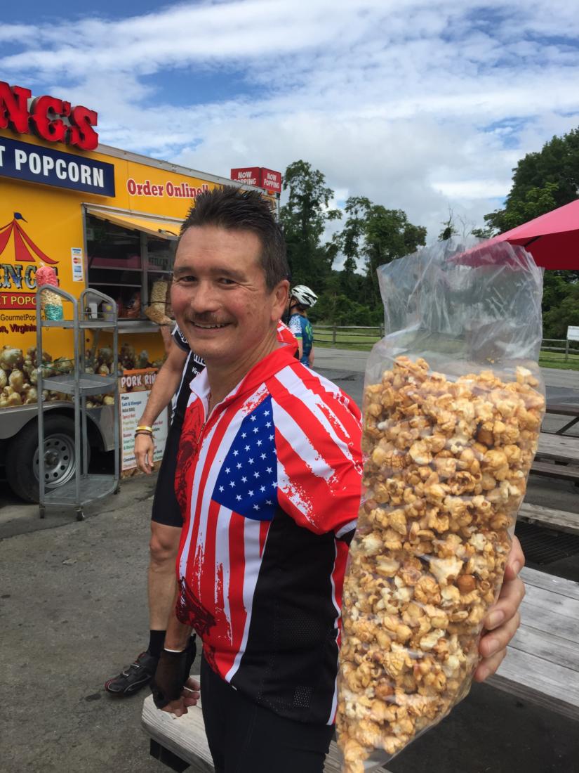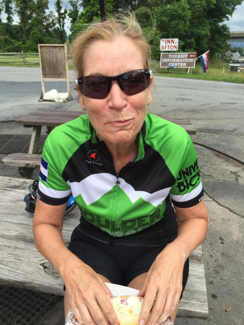 “A hot dog would be a terrible idea,” said both Steve Ruhf and fellow rider Barbara Butcher. Who then proceeded to order dogs with the works. Meanwhile, Daniel Anderson, who had been off the front all day, munched on caramel flavored kettle corn. In fact, pretty much everyone in the group ordered something that would be described by most cyclists as “bad food.” I ate a hot dog, and Mary shared my French fries. Man, is bad food good.
