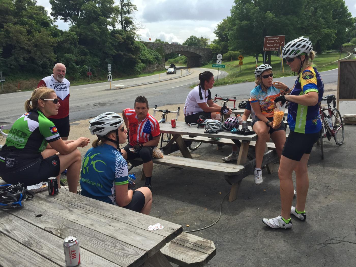 On the other hand, we had been looking forward to the ride for weeks, so Mary and I put on our optimist hats, loaded the cooler, put our bikes on the back of the car and headed for Wintergreen Resort where we would meet other members of our group who were either also driving in, or staying at the mountainside home of our host Steve Ruhf.