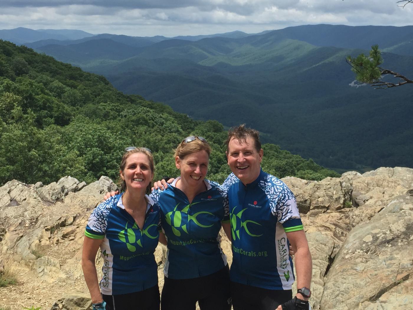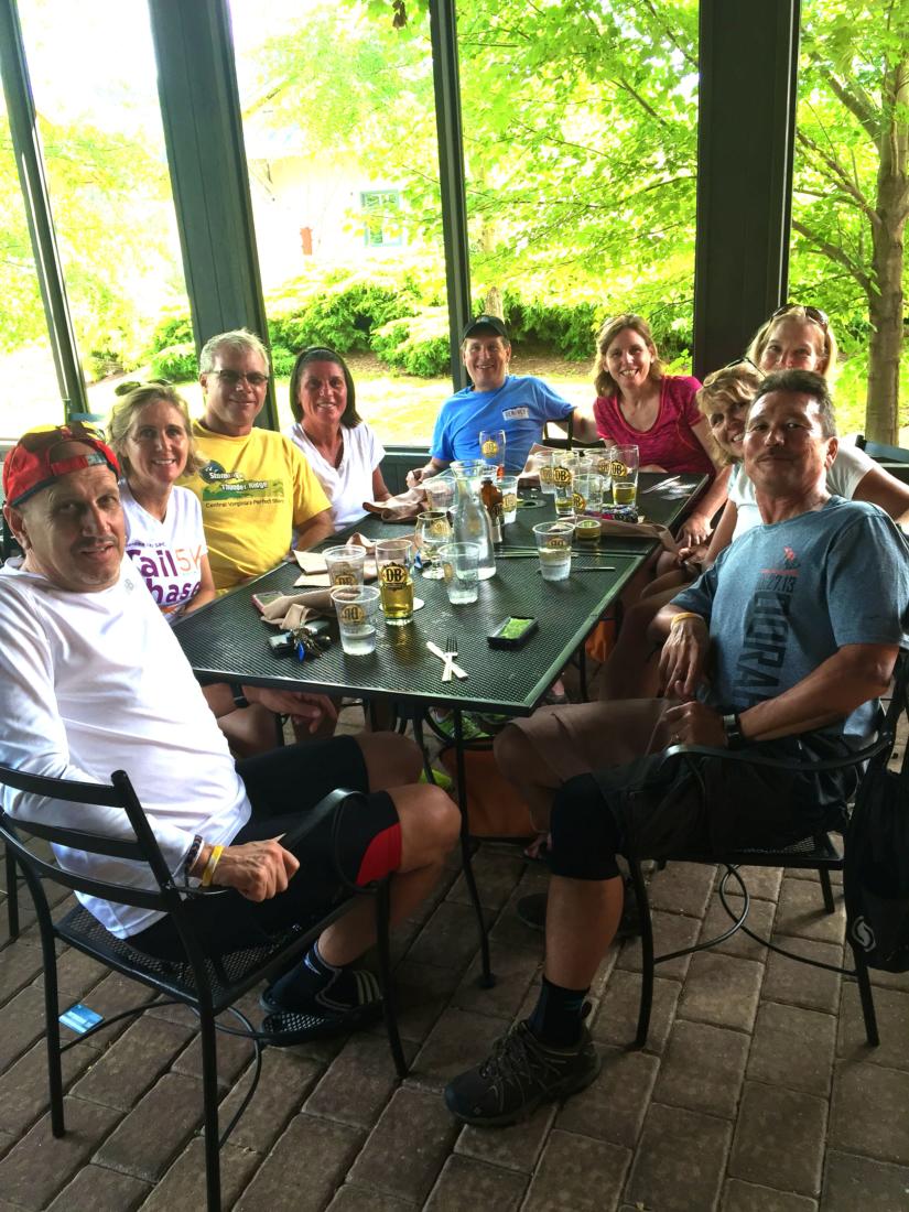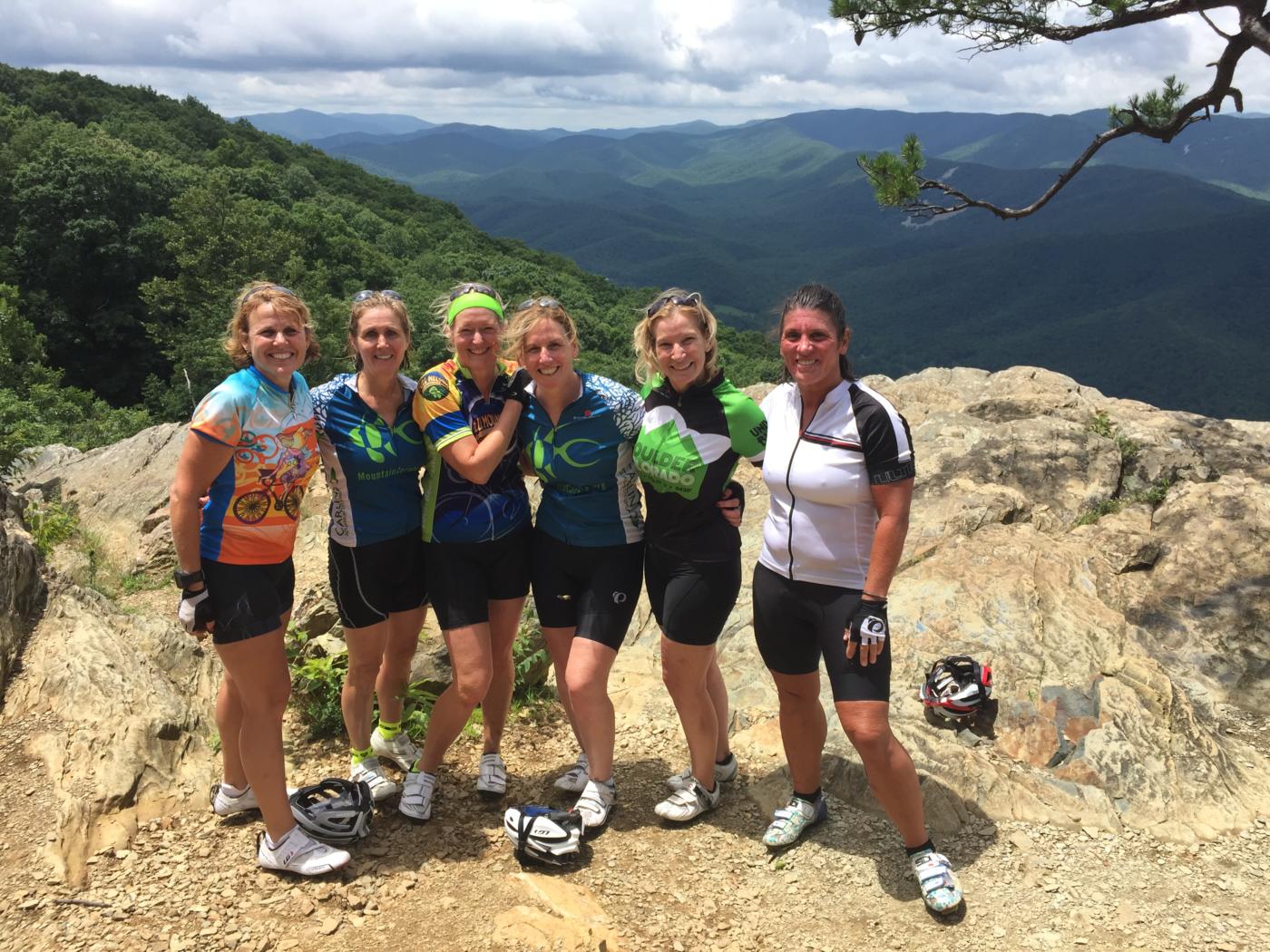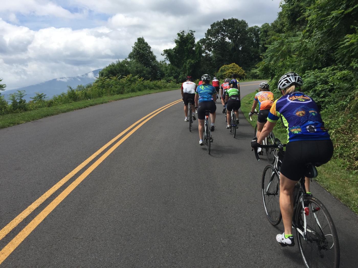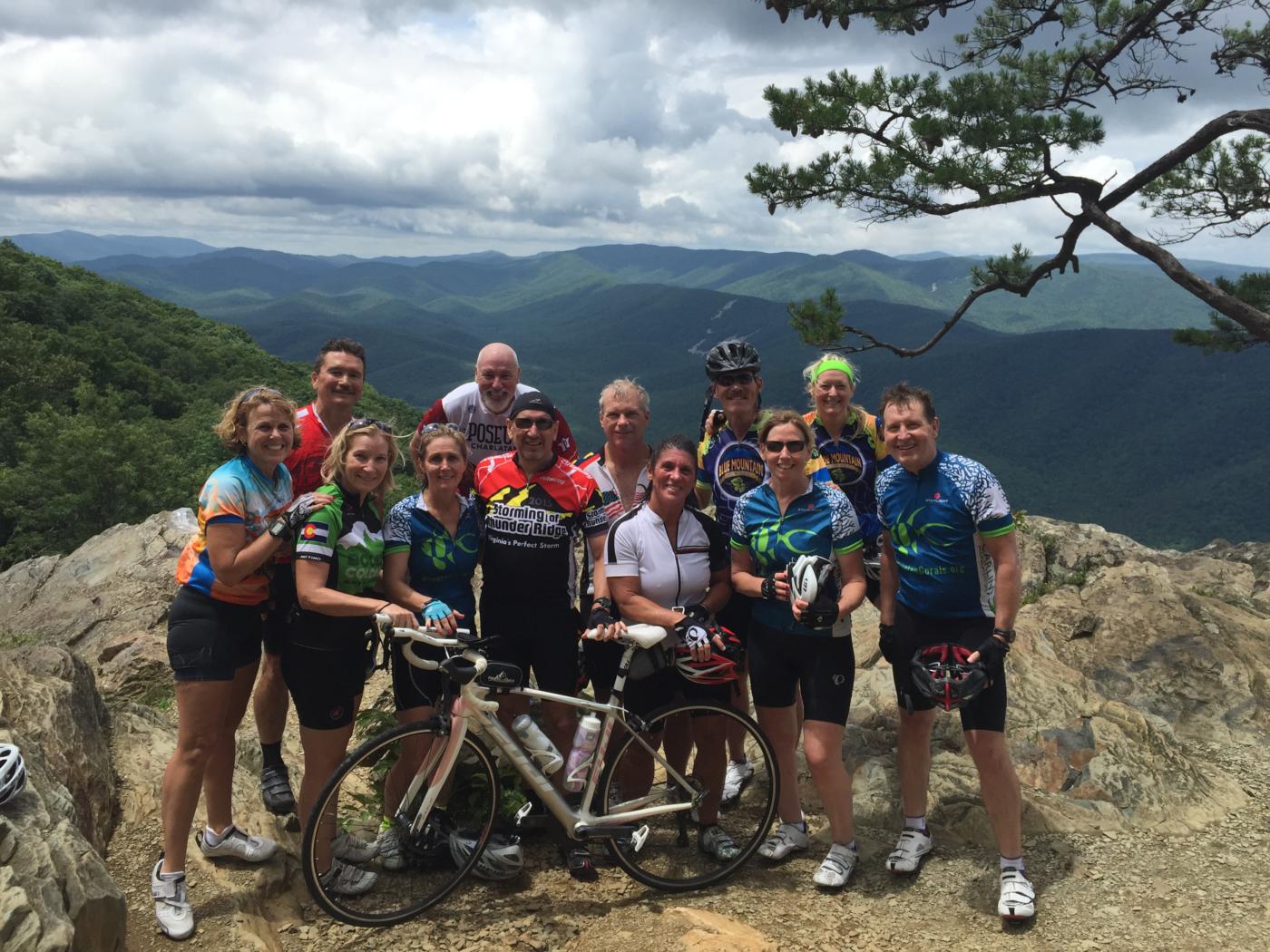 Happy cyclists at Raven’s Roost overlook on the Blue Ridge Parkway near Wintergreen. Left to right: Liz Futrell, Daniel Anderson, Barbara Butcher, Karen Deer, Pepe Hughes, Steve Ruhf, Carl Rhodes, Kelly Rhodes, Porter Peery, Mary Carlin, Katherin Wells, John Carlin
